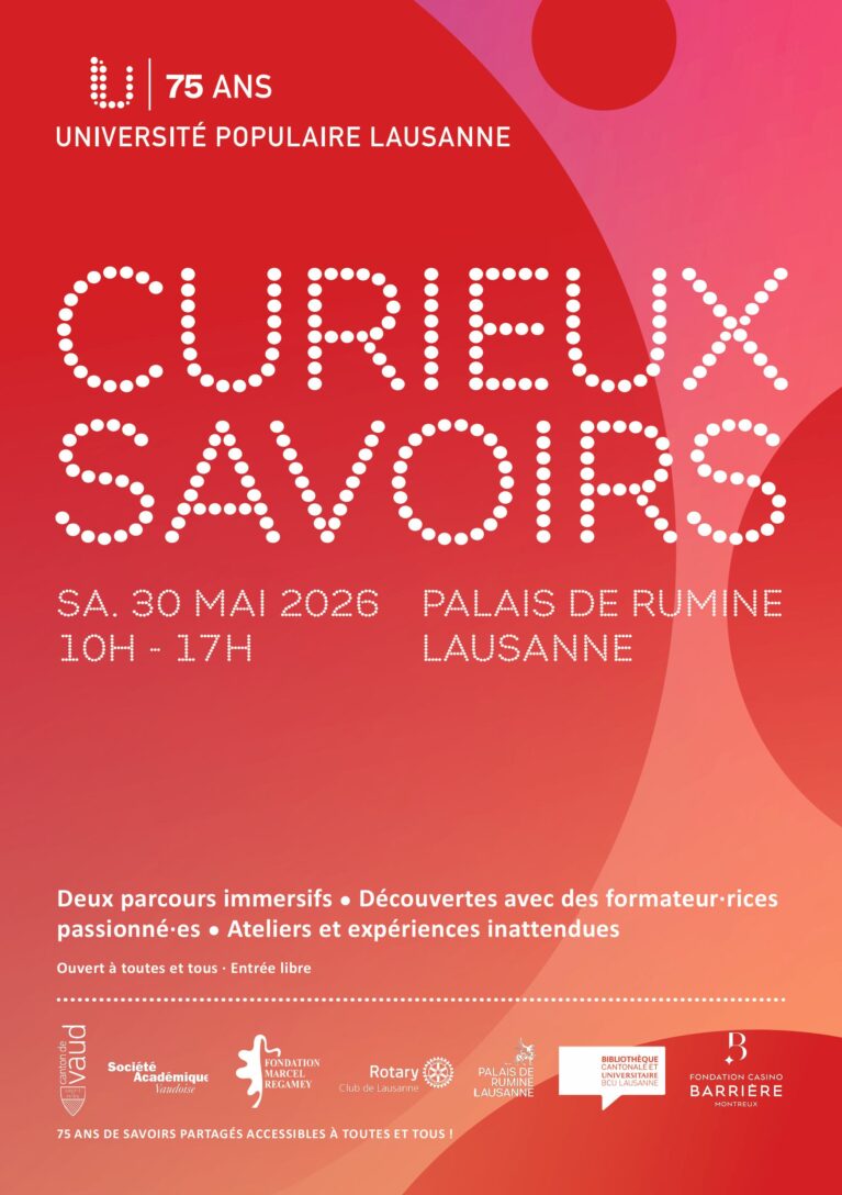 L’Université populaire de Lausanne célèbre 75 ans et vous invite à une journée festive le 30 mai au Palais de Rumine. Des spécialistes, dont Dominique Truchot-Cardot, parteageront leurs connaissances au travers de plusieurs ateliers interactifs et parcours immersifs. En savoir plus
